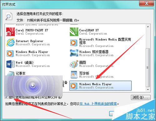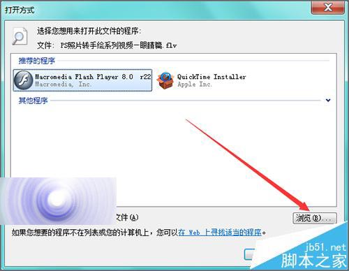 3、这时候,如果想要打开flv格式的视频,也可以直接利用电脑中自带的视频播放器来进行播放。我们在它的上面点击右键,选择打开方式---选择默认程序。然后在它弹出来的打开方式的界面中,在它的右下角点击浏览。