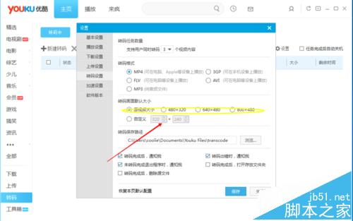 3、在页面中找到黄色圈出的部分“设置”,单击进入转码设置界面