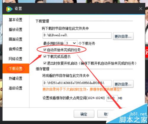 3、在【设置】界面下,点击选择【下载设置】--勾选【自动开始未完成的任务】--【应用】选项完成设置。(如图所示)