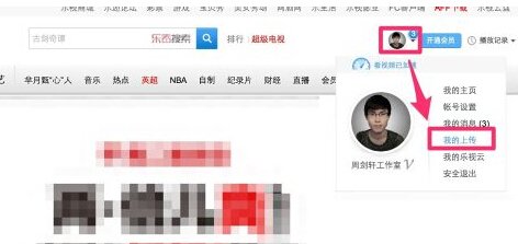 2、找到自己在乐视首页中的个人头像,然后点击一下,从下拉菜单中找到“我的上传”这一栏并点击进入下一步。