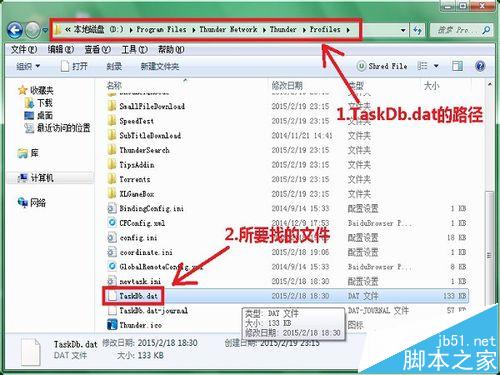 3、在迅雷安装目录打到TaskDb.dat文件,如X:Program Files\Thunder Network\Thunder\Profiles\TaskDb.dat(X为你迅雷的安装分区)。