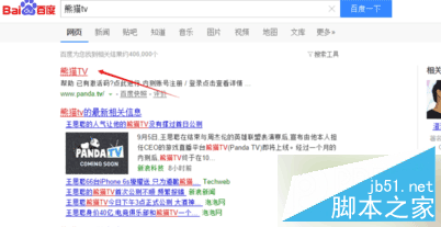 熊猫TV怎么绑定邮箱?首先,我们打开百度,输入“熊猫TV”,然后百度一下,找到第一个选项,进入熊猫TV官网。