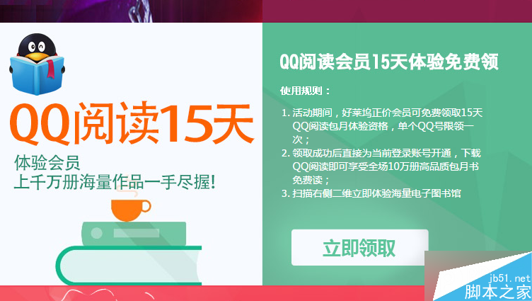 1.活动期间,好莱坞正价会员可免费领取15天QQ阅读包月体验资格,单个QQ号限领一次;