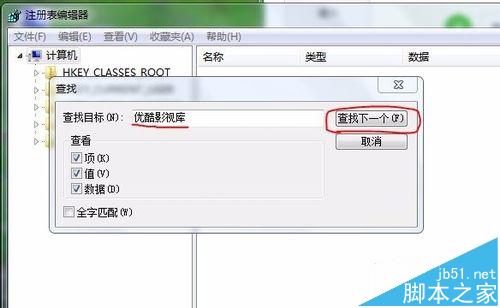 4、在查找目标中输入“优酷影视库”,然后点击查找下一个。系统会在注册表中查找包含此关键字的项。