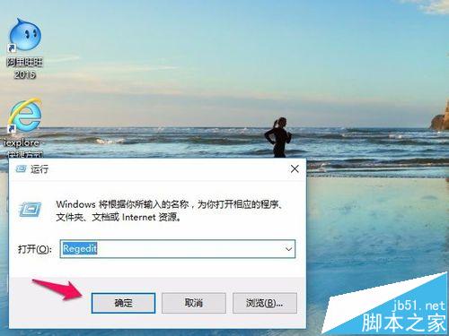 2、在打开后面键入命令:Regedit,然后点确定,如下图所示。