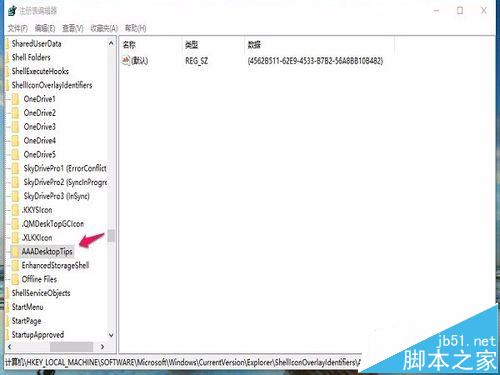 3、之后进入注册表项,注册表路径:HKEY_LOCAL_MACHINE\SOFTWARE\Microsoft\Windows\CurrentVersion\Explorer\ShellIconOverlayIdentifiers注册项:AAADesktopTips