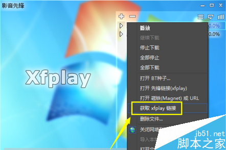 从打开的播放列表中右击要下载的视频文件,从弹出的扩展面板中选择”获取xfplay磁链“项。