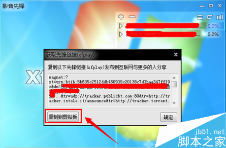从弹出的”获取xfplay磁链“窗口中点击”复制到剪贴板“按钮,以便复制磁链至剪贴板。