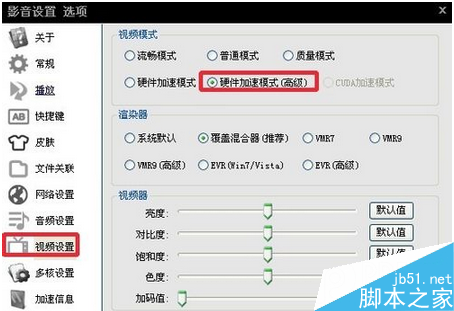 设置窗口的视频设置窗口,我们这里选择视频模式为硬件加速模式。