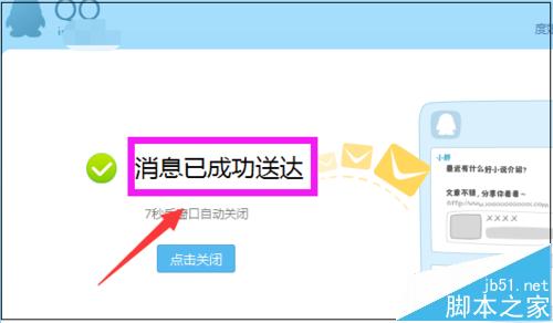 8、接下来就会看到一个消息提示窗口,告诉你消息已成功送达,可以点击关闭,如不点击关闭,几秒后窗口会自动关闭。