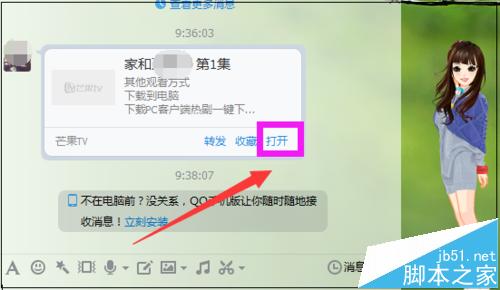 9、当你的QQ好友上线,在和你的聊天窗口,就会看到你分享给她的电视剧,也可以打开你刚刚分享电视剧的QQ群,就可以看到你刚才分享的电视剧,QQ好友或者QQ群友点击“打开”就可以观看电视剧喽!