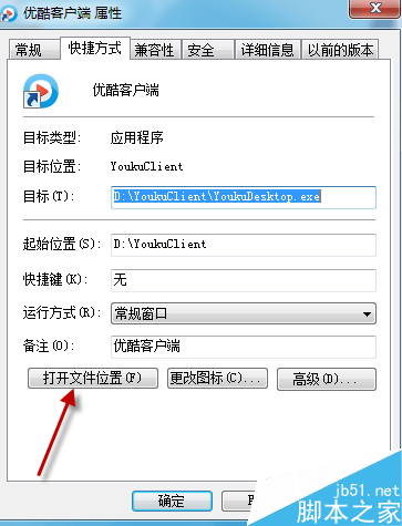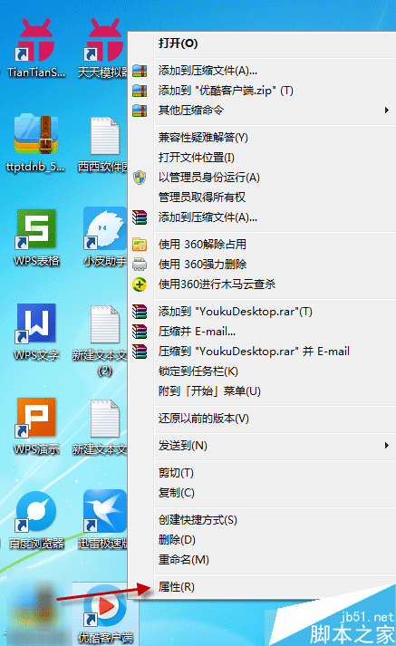 1、在桌面上的优酷客户端单击右键,出现快捷菜单,单击左键选择“属性”