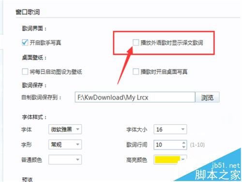 4、然后在【播放外语歌时显示译文歌词】前面画勾,就可以了,以后你再用酷我音乐播放外文歌曲的时候,它就会显示中文歌词。