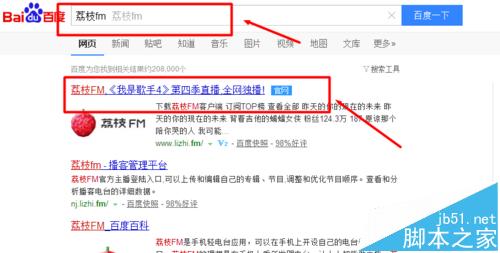 1、在百度的搜索栏上搜【荔枝fm】,会出现很多搜索结果,点击显示着官网的链接,打开【荔枝fm】