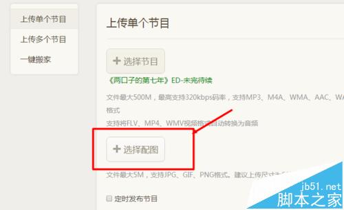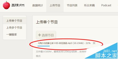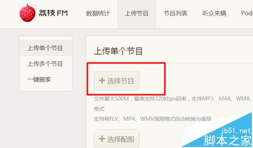 5、现在就开始上传节目,点击【选择节目】,会弹出来一个对话框,选择你要上传的文件,然后选择【打开】,之后你选的文件就会慢慢上传了,如图三
