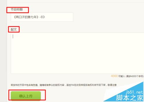 7、之后将【标题】和【配文】填写好,点击【开始上传】整个广播剧就上传了