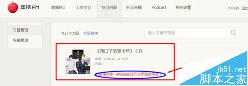 8、之后跳转页面会显示出你刚刚上传的广播剧,同时他会显示出要审核过后才能正式发布成功,之后就等审核就可以了,审核一般30分钟以内就会完成的。