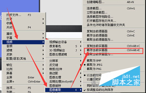 2、在视频选项卡里面,把鼠标先移动到【图像截取】,然后再选择【截存当前实画面】这一项。在【截存当前实画面】的后面有一个Ctrl+Alt+E的快捷组合键,这就是potplayer视频截图快捷键!