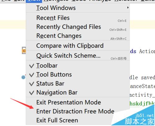 6、在下拉的菜单中进行选择为enter distraction free mode的选项菜单。