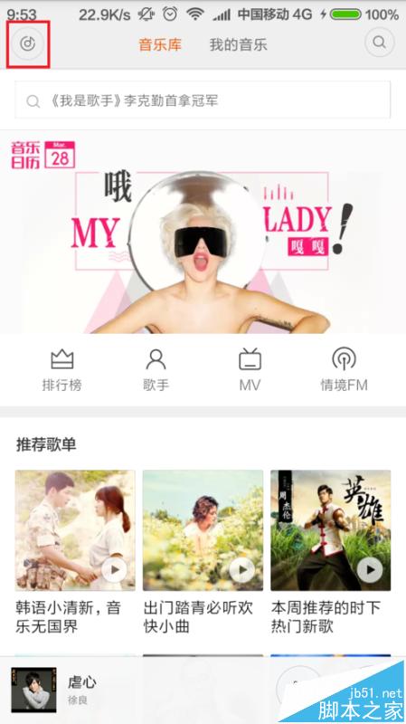 2、打开MIUI界面小米音乐应用主页面之后,点击页面左上角的“听歌识曲”按钮开关,然后将手机靠近播放音乐的位置。