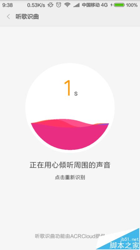 3、接下来,页面中将显示正在识别周围的音乐,识别需要几秒钟,在此过程中请大家耐心等待哦,注意不要发出一些噪音哦,以免影响识别效果。