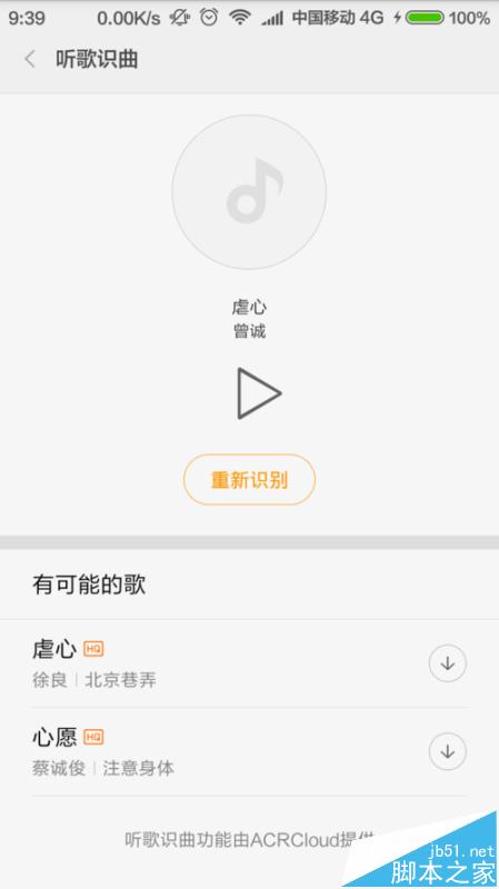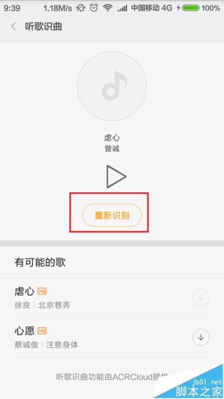 5、如果你感觉识别到的音乐名称存在错误的话,我们可以点击页面中的“重新识别”按钮,重新识别该音乐。