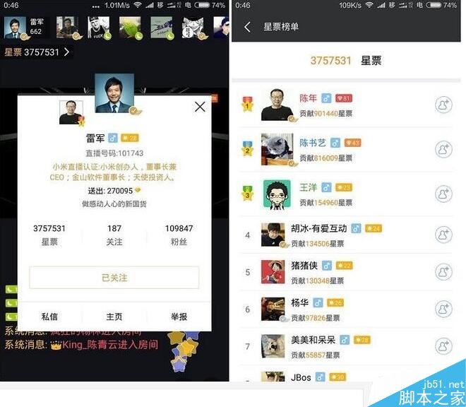 直播3小时,雷军获得了10万粉丝,以及375万星票,送出星票前三甲:凡客CEO陈年 90万星票,陈书艺 81万星票,王洋 15万星票。