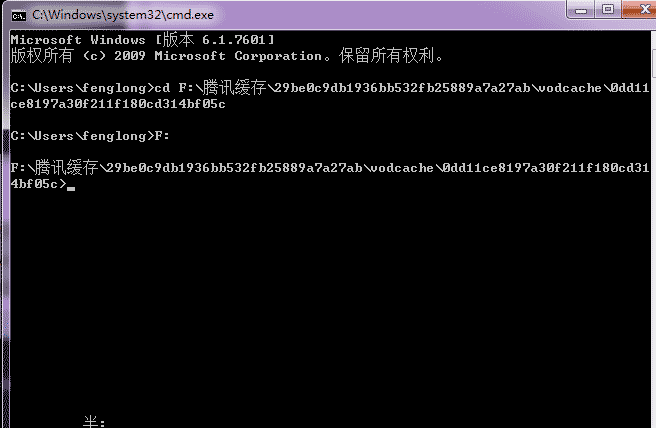 4、继续输入命令【F:】(因为现在演示的文件夹在F盘,所以我输入“F:”,如果大家的指定文件夹在D盘,则输入“d:”)输入完后按下【Enter】键,即可看到如图所示界面: