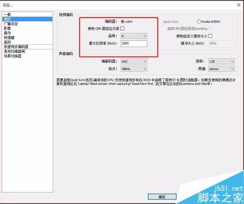 I 、取消CBR固定位元率II、 “品质”根据不同游戏进行修改射击、竞速和单机游戏类,请选6-7DOTA2、LOL、SC2等,请选7-8炉石传说、AVG类游戏,请选7-8视频录播,请选9-10III、最大比特率上行速度1Mbps左右的请设置最大码率为500kbps上行速度2Mbps左右的请设置最大码率为1500kbps最大码率最好不要超过2000kbps