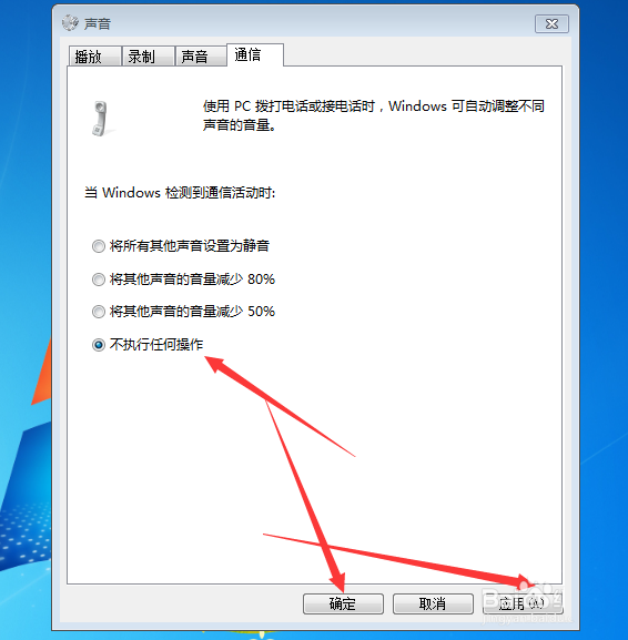 4、打开通信选项之后,我们在它底下的选项里选择“不执行任何操作” 如图