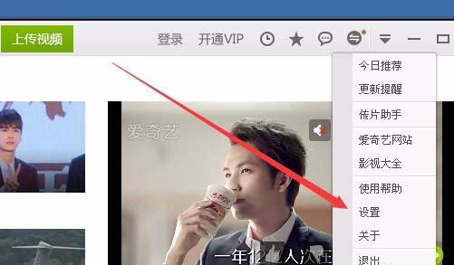 1、在打开的爱奇艺客户端,点击右上角的选项按钮,在弹出菜单中点击“设置”菜单项