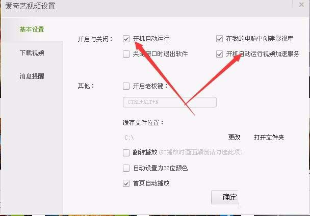 2、在打开的爱奇艺视频设置窗口中,取消掉“开机自动运行”与“开机自动运行视频加速服务”前的两个复选框