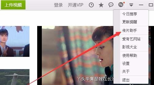 7、接下来我们再次点击客户端右上角的选项按钮,在弹出菜单中选择“传片助手”菜单项