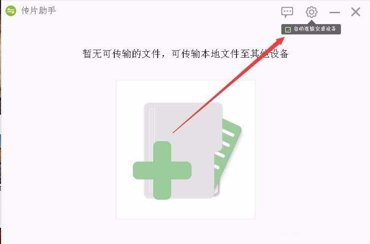 8、这时会打开传片助手窗口,点击右上角的设置按钮,在弹出菜单中去掉“自动连接安卓设备”前的勾选