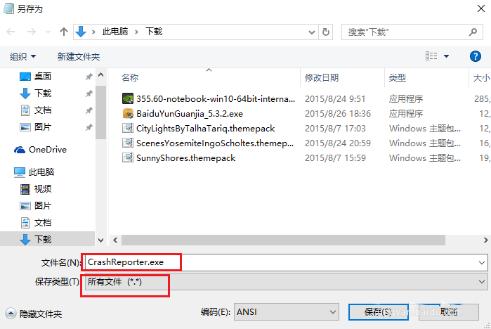 3、新建文本文件,文件名为CrashReporter,选择另存为,保存时选择所有文件(注意保存好以后的文件扩展名为exe)