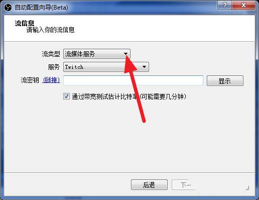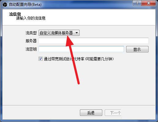 7、在流类型中,点击它后面那个小三角,出来就是自定义流媒体服务器了。