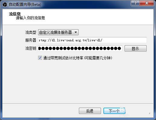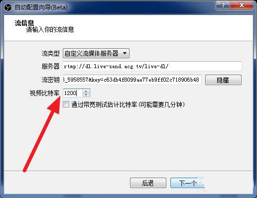 10、然后将“通过宽带测试。。。。“前面的框框√去掉,直接填写1200。你可以根据你的电脑配置自己写比特率,我这个值有点低,因为用默认的2500显示连接不上服务器。点击“下一个”