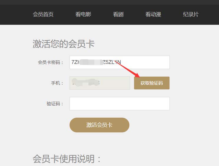 5、进入优酷会员卡激活页面后,在激活您的会员卡下面的会员卡密码那里输入密码,然后点击获取验证码,如下图所示。