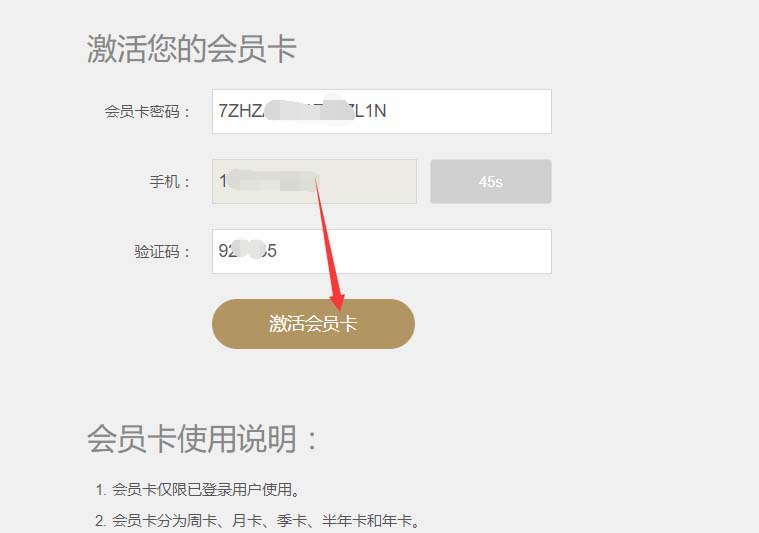 6、输入手机收到激活会员卡的验证码,然后点击激活会员卡,如下图所示。