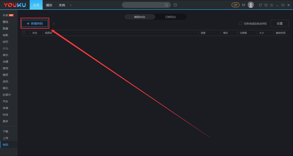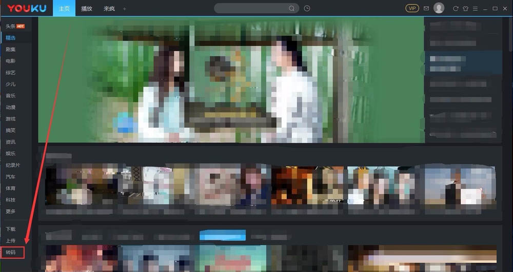 1、打开优酷客户端,点击左侧的功能“转码”标签;