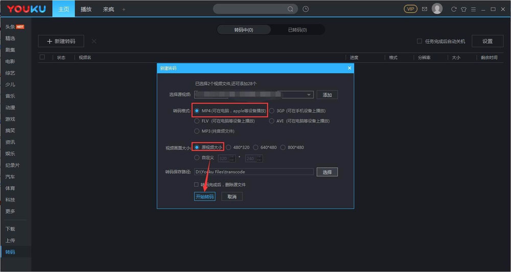 5、将转码的格式定位在“MP4”视频大小,建议启用“原视频大小”或者自定义一个大小的视频,其他感觉都小了不建议选择不过也要看个人的喜好啦,设置好后点击“开始转码”;