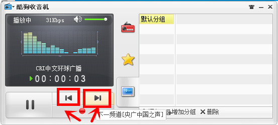 5、此时,在电脑界面中,我们可以看到收音机出现在我们眼前,我们可以通过左右选择按钮来选择收音频道;