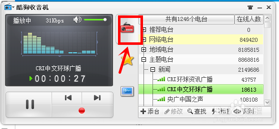 6、我们要想查看更多电台情况,我们选择收音机中间的收音机图标即可看到各类电台;
