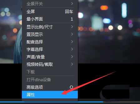2、然后进行打开一个的暴风影音播放器,进行右键弹出了下拉菜单选中为属性的选项。