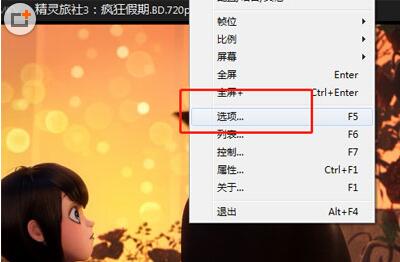 1、首先打开播放,在播放器的界面上鼠标右键,点击【选项】,当然了也可以直接通过按【F5】打开选项设置界面。