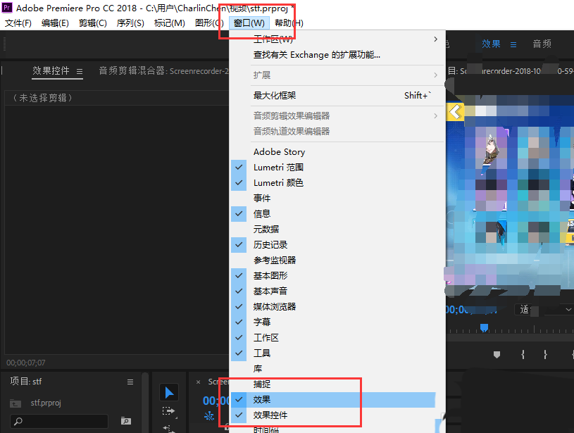 1、在"窗口"菜单下勾选"效果"和"效果控件"两项,使其面板显示出来。