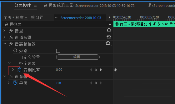 4、选定音轨,转到“效果控件”面板,在"音高换档器"中点开“各个参数”,再点开“变调比率”滑动滑杆可调节比率。