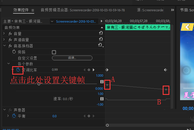 5、如图,在需要实现效果的音频两端设置关键帧,A帧“变调比率”设为1,B帧“变调比率”设为0.5。试听一下,实现效果!