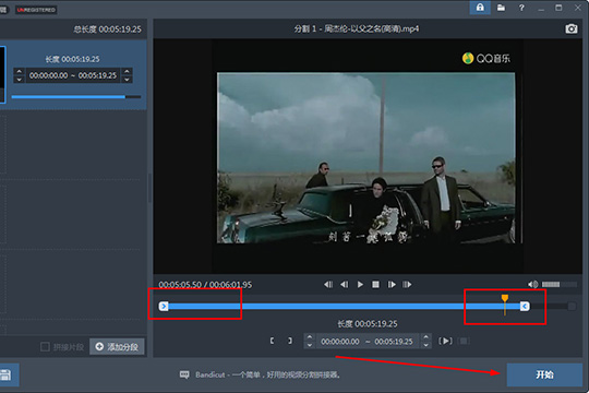 2、在上一步点击并导入想要裁剪的视频文件后,软件将会自动跳转到截取的功能界面,大家可以在左边的截取列表看到视频的总长度,点击某个视频文件,在右边出现播放窗口与时间线,其中蓝线就是整个视频长度,大家可以根据自己的需要调整去除片头与片尾的时间点,只需要进行拖动红框标注内的拖动调即可,在选择完成后会在下方出现裁剪后视频长度,视频裁剪工作做到这边就结束了,下面就是要将裁剪成功的视频进行导出了,点击“开始”选项即可,如下图所示: