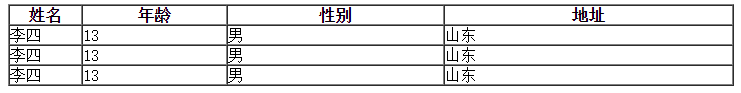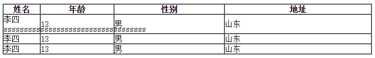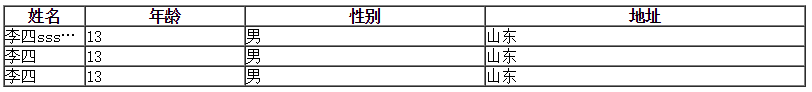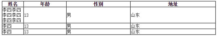 如下代码所示,表格中安排了姓名、年龄、性别以及地址四列,这几个列的长度分别为10%、20%、30%、40%。